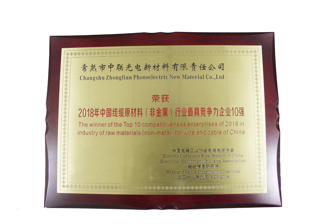 9月27日,2018中國電線(xiàn)電纜行業(yè)大會(huì )在上海召開(kāi),會(huì )上揭曉了《中國線(xiàn)纜原材料(非金屬)行業(yè)最具競爭力企業(yè)10強》榜單。經(jīng)過(guò)各項嚴苛指標的逐一檢驗,常熟中聯(lián)光電榮獲前四強。